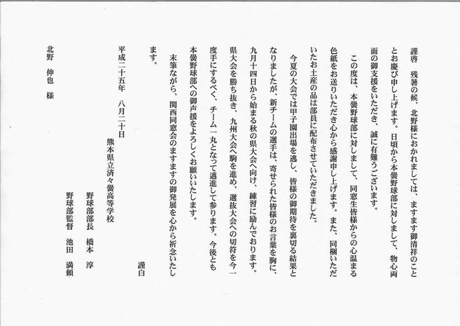 野球部部長・監督礼状